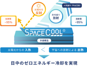 放射冷却素材(赤外線が温かい地表から-270℃の宇宙空間へ放出され気温低下する自然現象)を応用して、高効率でゼロエネルギーによる冷却を実現した素材。